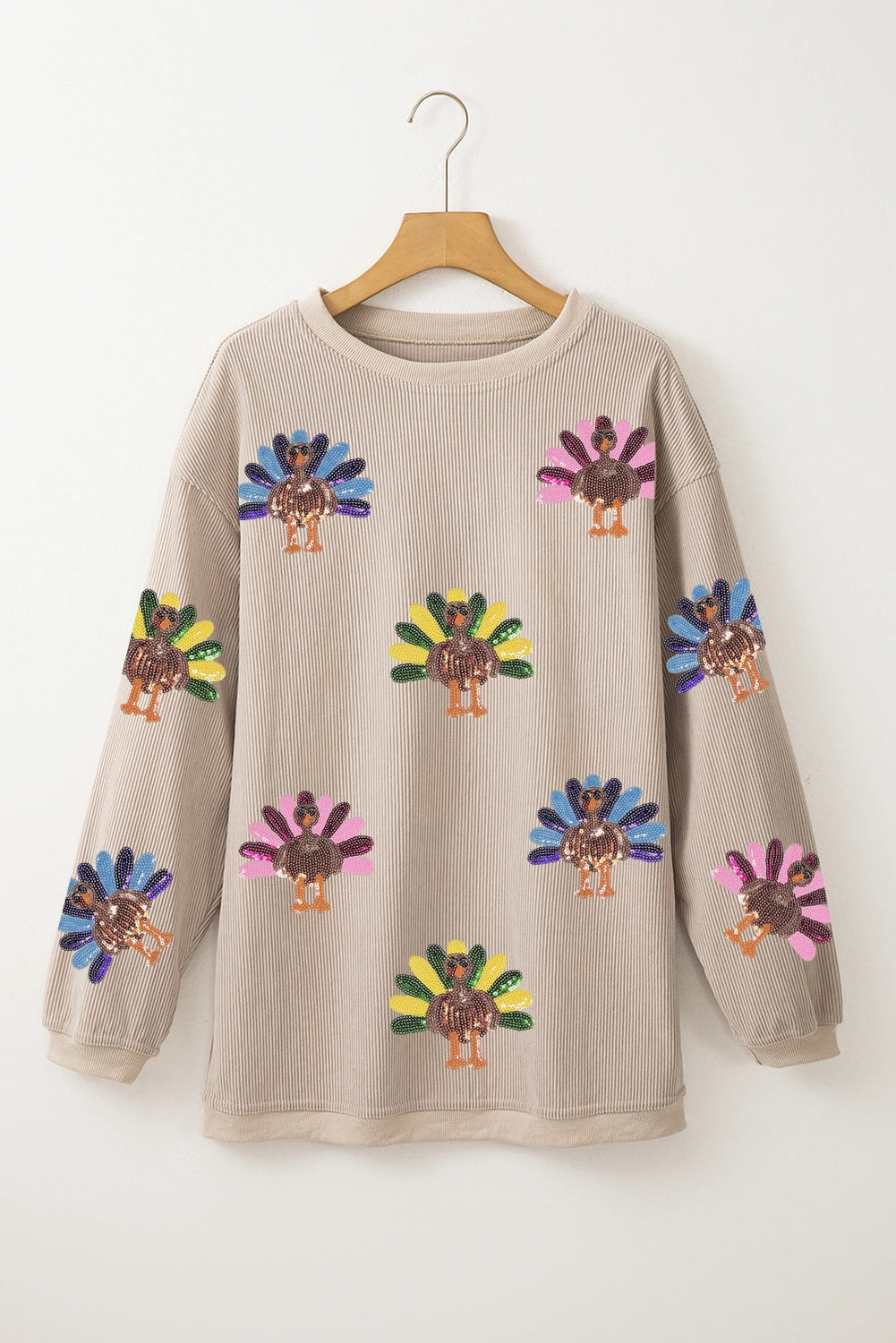 Bring a little sparkle to your fall wardrobe with this cozy corded sweatshirt featuring colorful sequin turkeys. The oversized fit makes it perfect for lounging, running errands, or celebrating Thanksgiving in comfort and style.