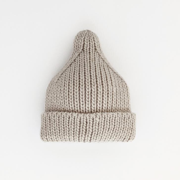 Just the cutest pointy 'Peak' hat looks so fun on littles. This is knit in a cozy Oatmeal hued Icelandic yarn in a Shaker knit with fold up brim. This makes a fun shower gift and is perfect for cooler weather.