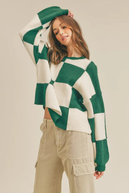 This checkerboard sweater makes it so easy to put together a trendy look! A warm and cozy knit creates this classic sweater and its rounded neckline, drop shoulder long sleeves, and a boxy bodice with a slightly cropped hem. Throw on your favorite bottoms for an effortlessly trendy fit!
