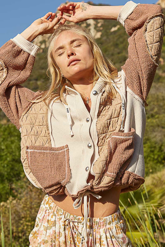 An oversized button-down jacket designed with a laid-back fit. Crafted from a mix of thermal, quilted knit, and cut-and-sew sweater knit fabrics, it features a hood for added comfort and a unique, textured look. Perfect for layering and staying cozy while keeping your style elevated.